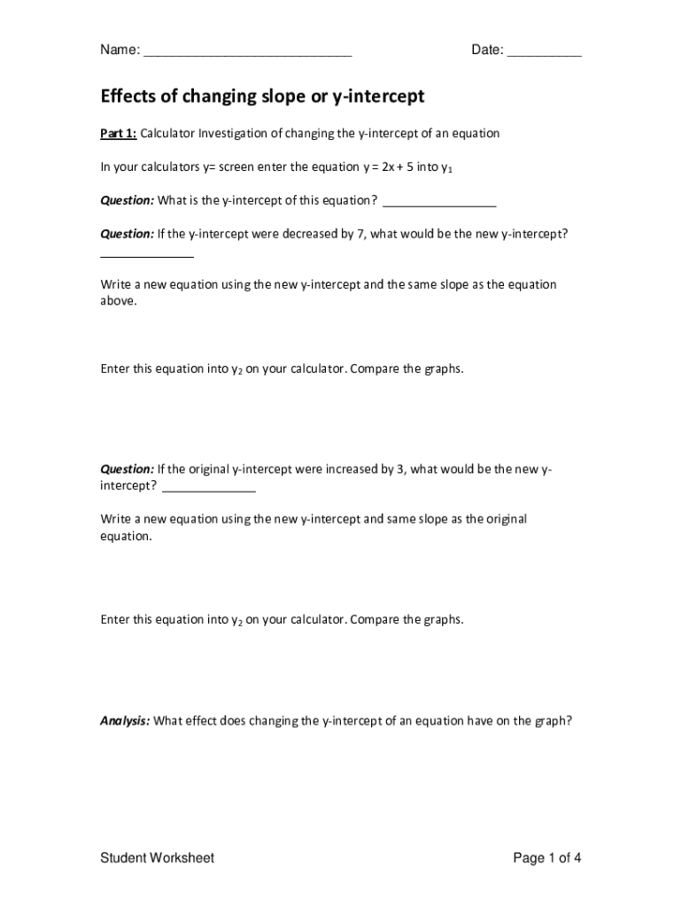 Name: ___Date: ___Effects of changing slope or yintercept Part 1: Calculator Investigation of changing the yintercept of an equation In your calculators y screen enter the equation y 2x + 5 into y1 Question: What is the yintercept of this equation? ___ Question: If the yintercept were decreased by 7, what would be the new yintercept? ___ Write a new equation using the new yintercept and the same slope as the equation above.Enter this equation into y2 on your calculator. Compare the graphs