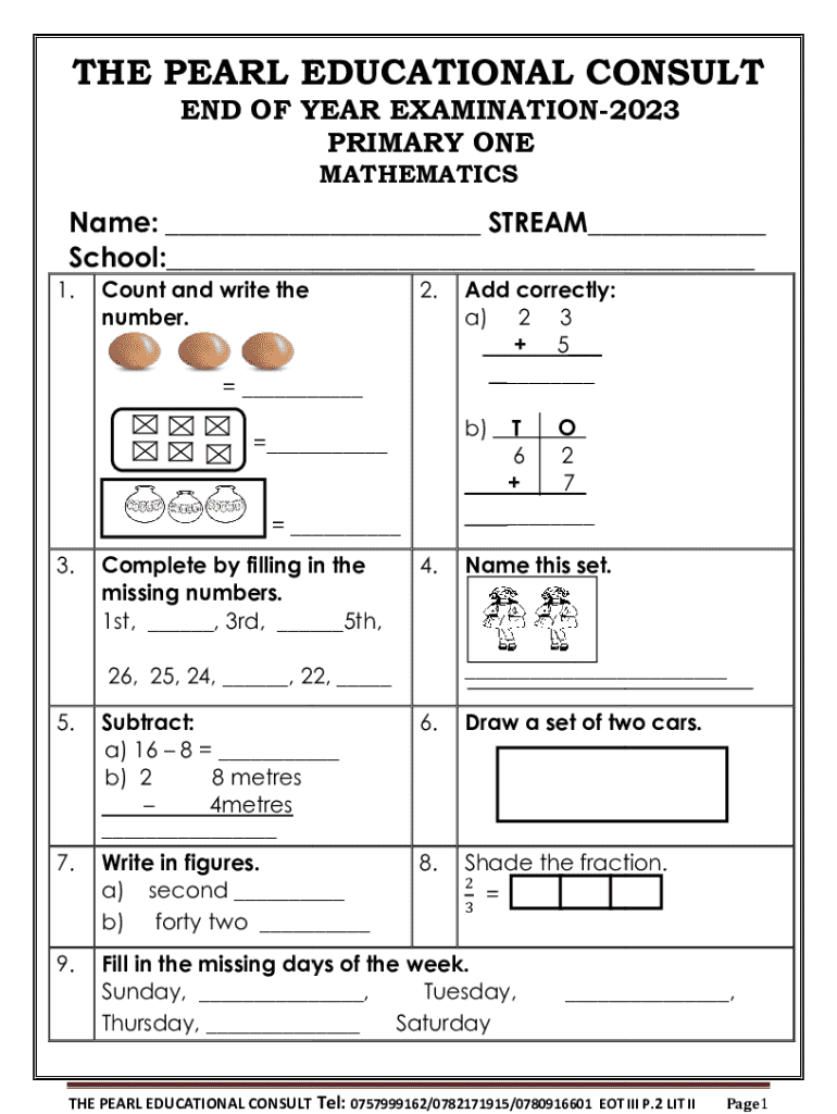 This document is an end-of-year examination paper for Primary One Mathematics, designed to assess students\' understanding of basic mathematical concepts, including counting, addition, subtraction, multiplication, and shape identification. The paper consists of various types of questions such as fill-in-the-blanks, drawing tasks, and practical applications of mathematics.