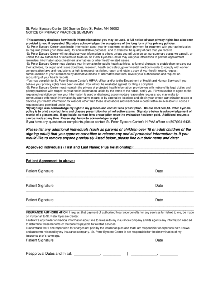 This document outlines how your health information may be used by St. Peter Eyecare Center and details your privacy rights concerning your health information. It includes acknowledgment of receipt of privacy practices, rights related to prescriptions, and insurance authorization.
