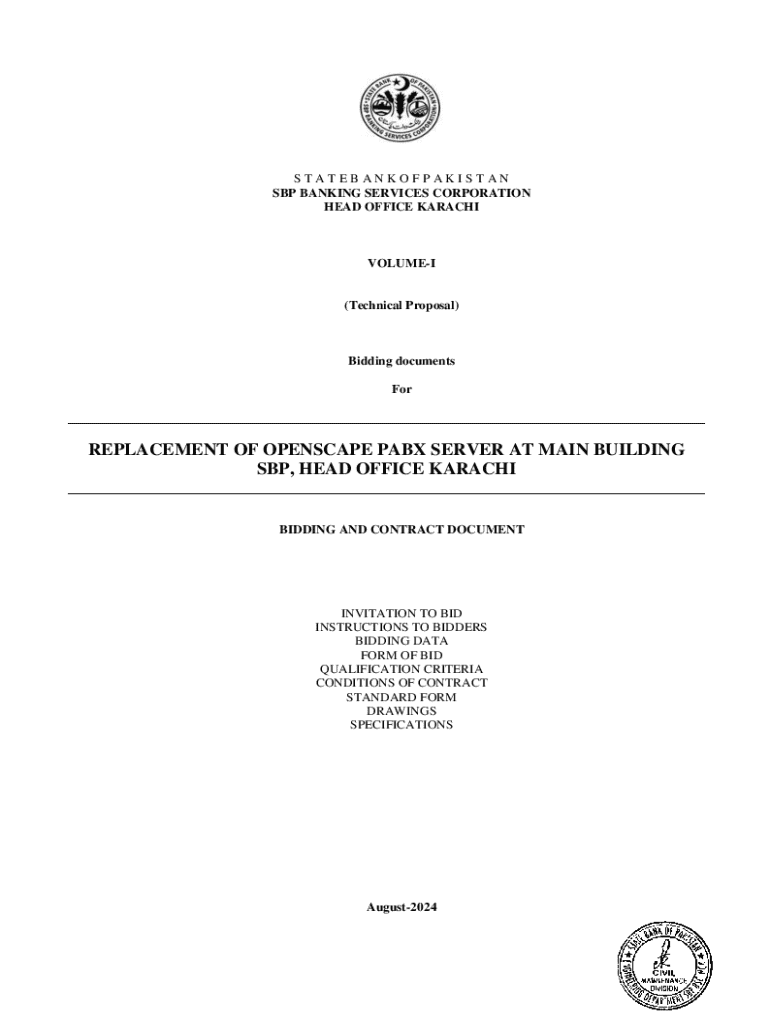 STATEBANKOFPAKISTAN SBP BANKING SERVICES CORPORATION HEAD OFFICE KARACHIVOLUMEI(Technical Proposal)Bidding documents ForREPLACEMENT OF OPENSCAPE PABX SERVER AT MAIN BUILDING SBP, HEAD OFFICE KARACHIBIDDING AND CONTRACT DOCUMENTINVITATION TO BID INSTRUCTIONS TO BIDDERS BIDDING DATA FORM OF BID QUALIFICATION CRITERIA CONDITIONS OF CONTRACT STANDARD FORM DRAWINGS SPECIFICATIONSAugust2024ED/PROCHOK/102189/2024/185SBP BANKING SERVICES CORPORATION Engineering Department Head Office Karachi...