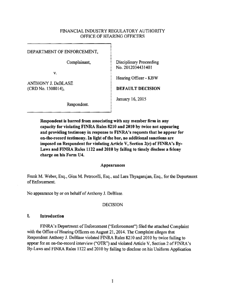 This document constitutes a default decision issued by the FINRA Office of Hearing Officers regarding respondent Anthony J. DeBlase, who is barred from associating with any FINRA member firm for failing