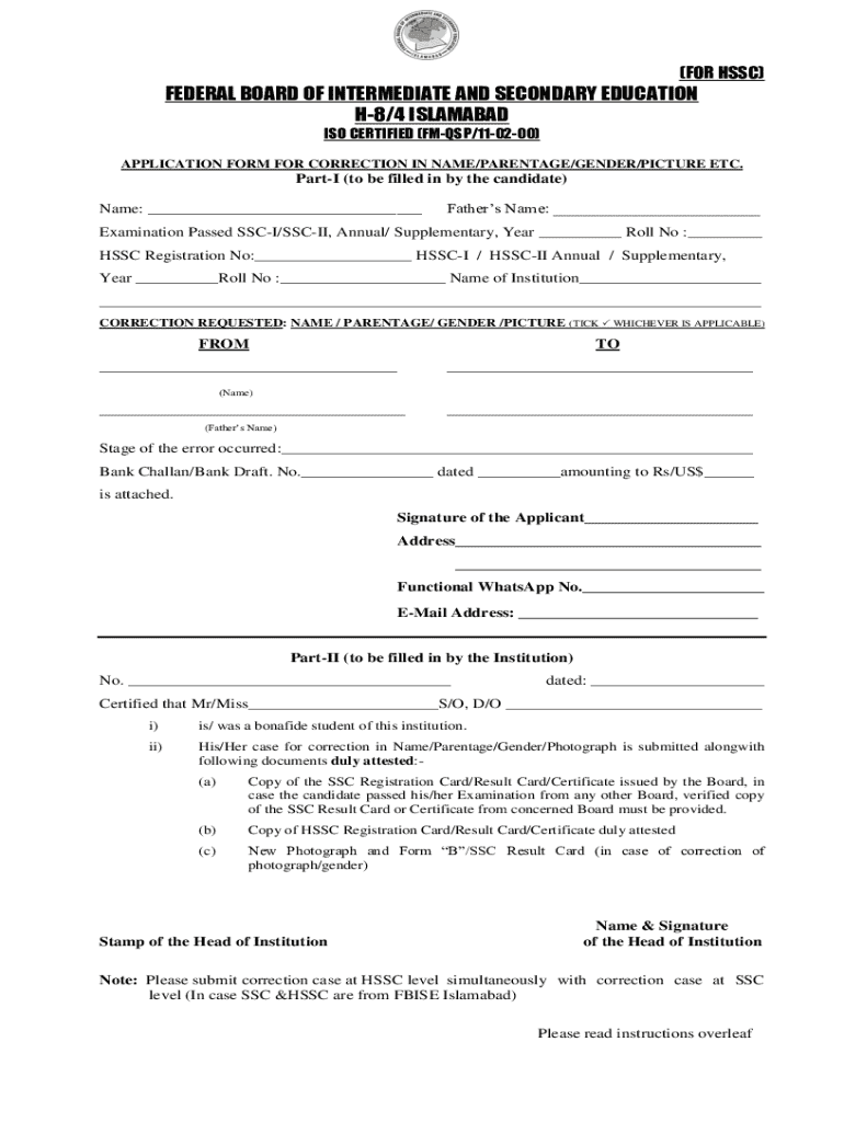 این فارم وفاقی بورڈ برائے ثانوی اور انٹرمیڈیٹ تعلیم کی جانب سے نام، والدین، جنس یا تصویر میں اصلاح کے لئے درخواست دینے کے لئے ہے۔ اس میں درخواست گزار کی تفصیلات اور ضروری دستاویزات کی فراہمی کی ہدایت شامل ہیں۔