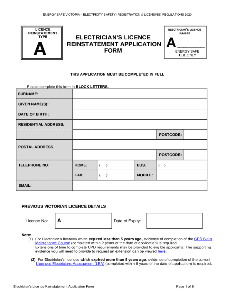 A form required for the reinstatement of an electrician\'s licence in Victoria, detailing personal information, previous licence details, and any disciplinary actions, along with a privacy statement