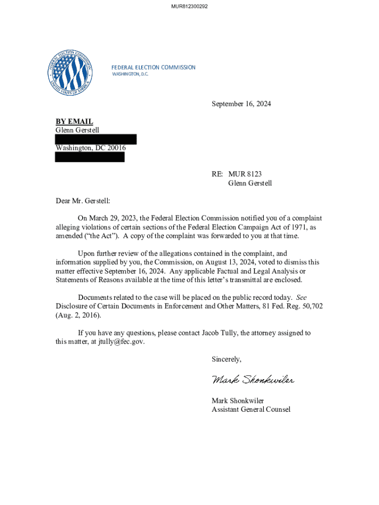 MUR812300292FEDERAL ELECTION COMMISSION WASHINGTON, D.C.September 16, 2024 BY EMAIL Glenn Gerstell Washington, DC 20016 RE: MUR 8123 Glenn Gerstell Dear Mr. Gerstell: On March 29, 2023, the Federal Election Commission notified you of a complaint alleging violations of certain sections of the Federal Election Campaign Act of 1971, as amended (the Act). A copy of the complaint was forwarded to you at that time. Upon further review of the allegations contained in the complaint, and information