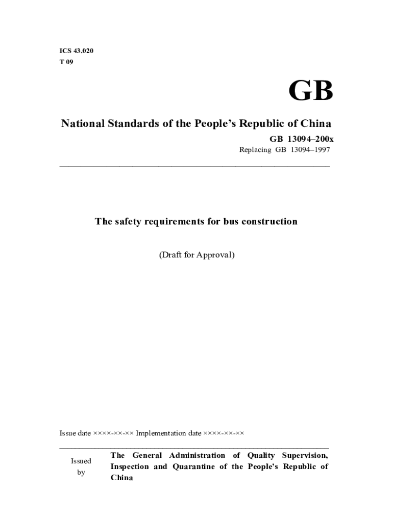 This Standard specifies the mandatory safety requirements for the construction of buses, applicable particularly to Grade I, Grade II, and Grade III single-decker buses in Category M2 and Category M3. It includes details about strength, stability, fire prevention, exits, and provisions for passengers with reduced mobility, among others.