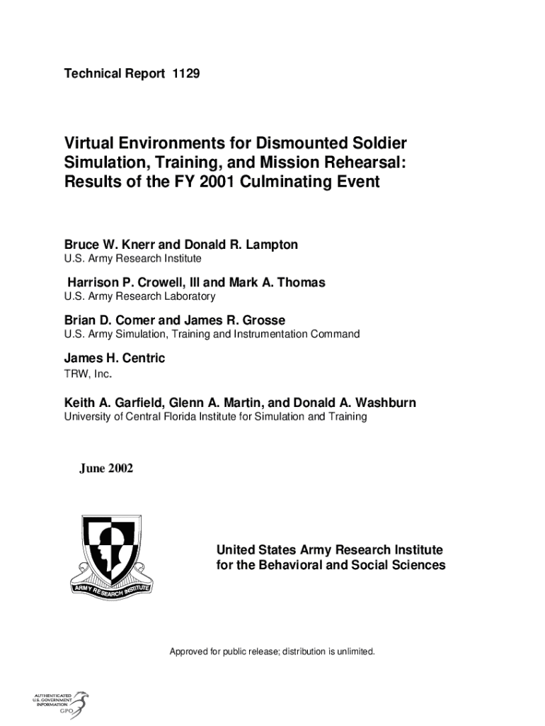 This technical report describes the activities and results of the third year culminating event of the Science and Technology Objective focused on Virtual Environments for Dismounted Soldier Simulation. The report covers the integration and evaluation of various technologies aimed at improving dismounted soldier simulation capabilities, emphasizing training effectiveness and technological advancements in virtual environments.