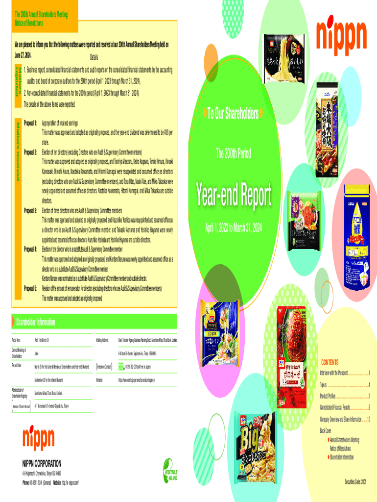 The 200th Annual Shareholders Meeting: Notice of Resolutions We are pleased to inform you that the following matters were reported and resolved at our 200th Annual Shareholders Meeting held on June 27, 2024. DetailsMatters reported1. Business report, consolidated financial statements and audit reports on the consolidated financial statements by the accounting auditor and board of corporate auditors for the 200th period (April 1, 2023 through March 31, 2024). 2. Nonconsolidated financial...