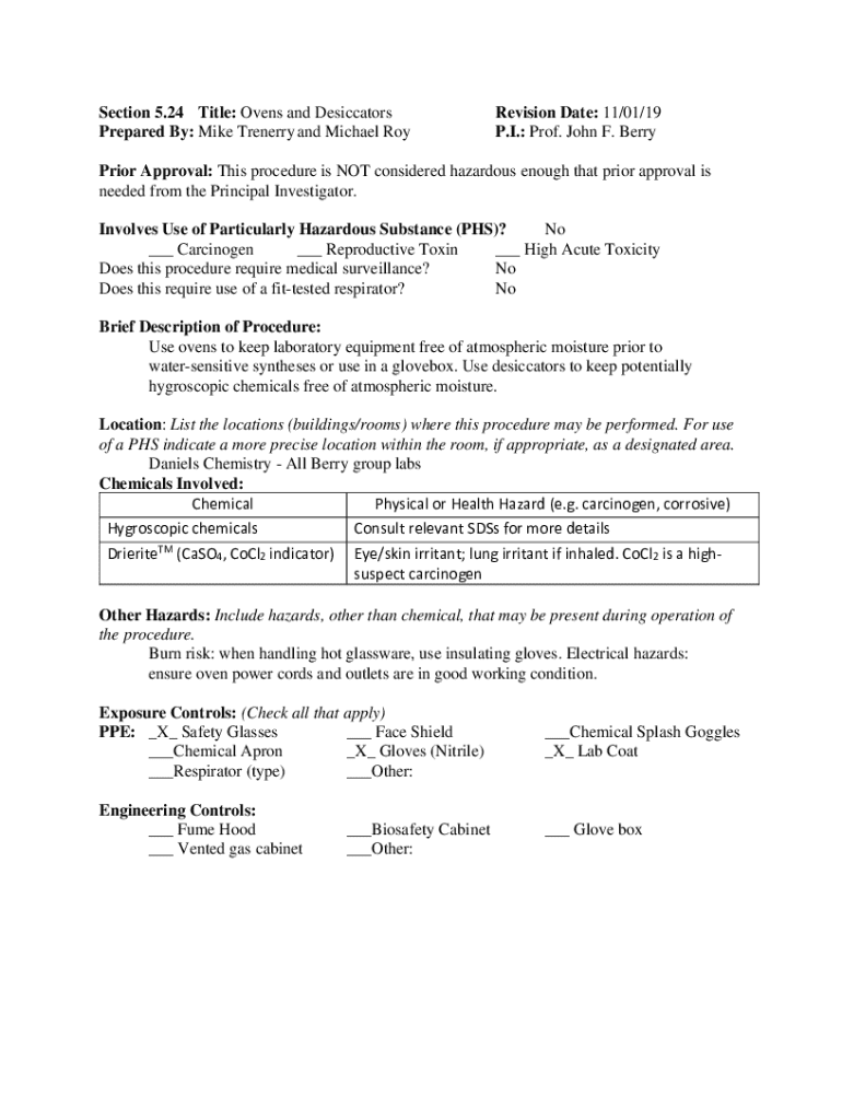 Section 5.24 Title: Ovens and Desiccators Prepared By: Mike Trenerry and Michael RoyRevision Date: 11/01/19 P.I.: Prof. John F. BerryPrior Approval: This procedure is NOT considered hazardous enough