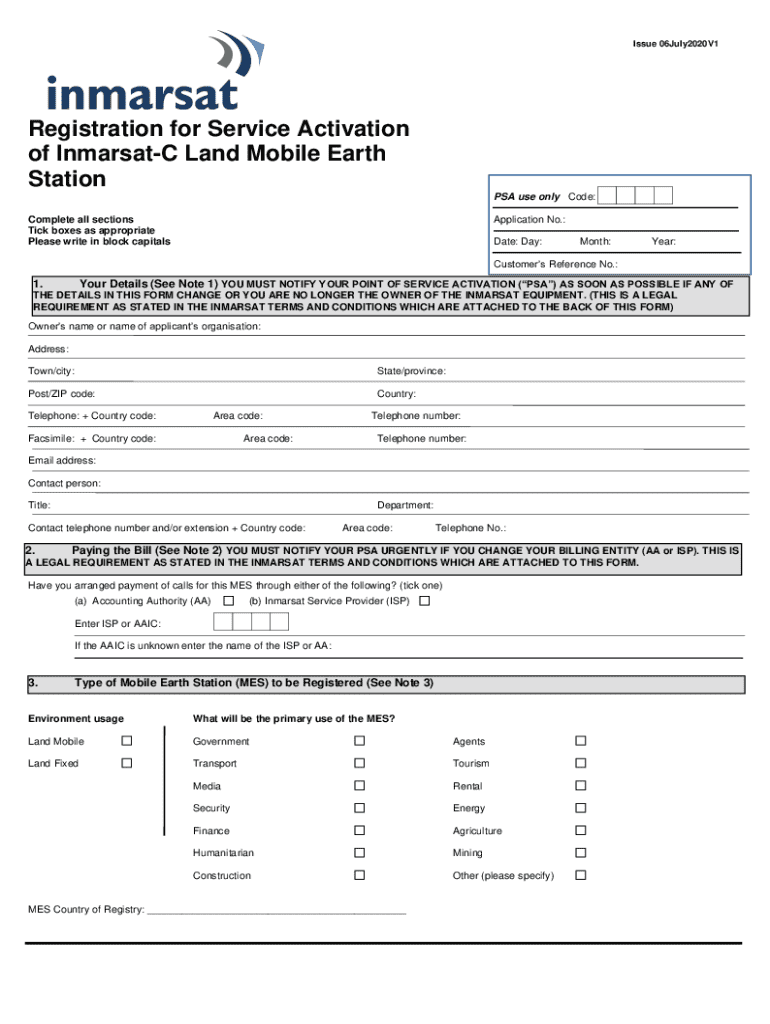 This form is used to register a Mobile Earth Station (MES) for activation on the Inmarsat services. It requires detailed information about the owner, billing arrangements, type of MES, and compliance