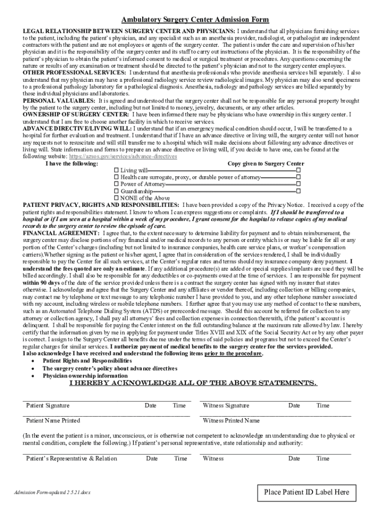 Edit ambulatory surgery center admission. Rearrange and rotate pages, add new and changed texts, add new objects, and use other useful tools. When you're done, click Done. You can use the Documents tab to merge, split, lock, or unlock your files.