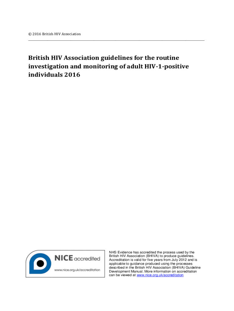 2016 British HIV Association ___British HIV Association guidelines for the routine investigation and monitoring of adult HIV1positive individuals 2016NHS Evidence has accredited the process used by the British HIV Association (BHIVA) to produce guidelines. Accreditation is valid for five years from July 2012 and is applicable to guidance produced using the processes described in the British HIV Association (BHIVA) Guideline Development Manual. More information on accreditation can be viewed...