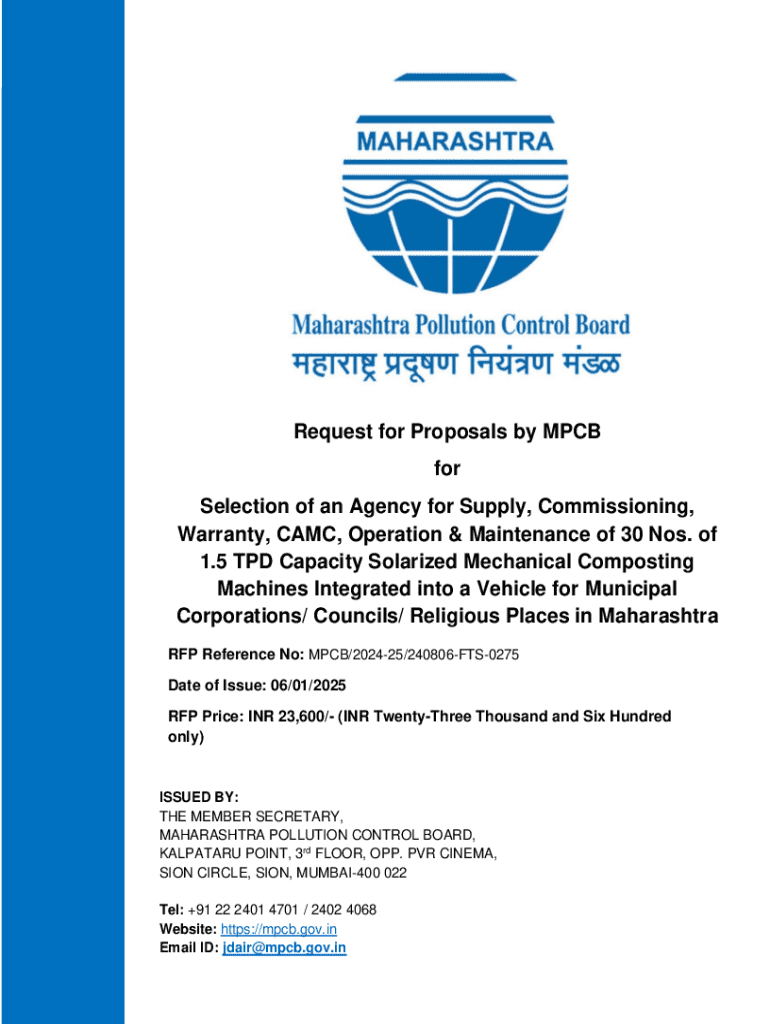 This document outlines the Request for Proposals (RFP) issued by the Maharashtra Pollution Control Board (MPCB) for the selection of an agency responsible for supplying, commissioning, and maintaining solarized mechanical composting machines. The project emphasizes sustainable waste management practices integrated into vehicles for various municipal and religious locations in Maharashtra.