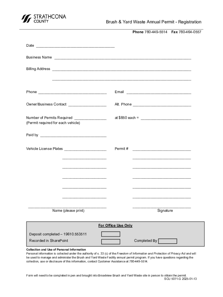 This form is used to register for the Brush and Yard Waste Annual Permit, which requires personal information and vehicle details for processing permits at a fee of $850 each.