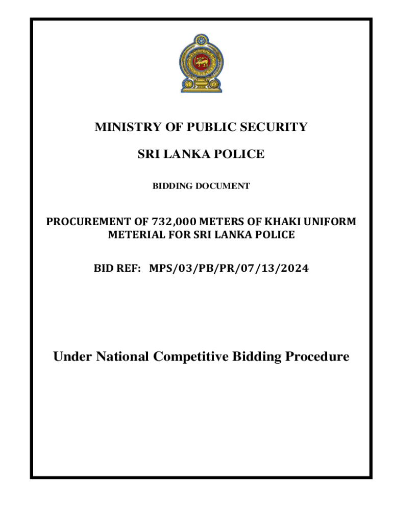 This document outlines the processes and requirements for submitting bids for the procurement of 732,000 meters of khaki uniform material for the Sri Lanka Police under national competitive bidding procedures.