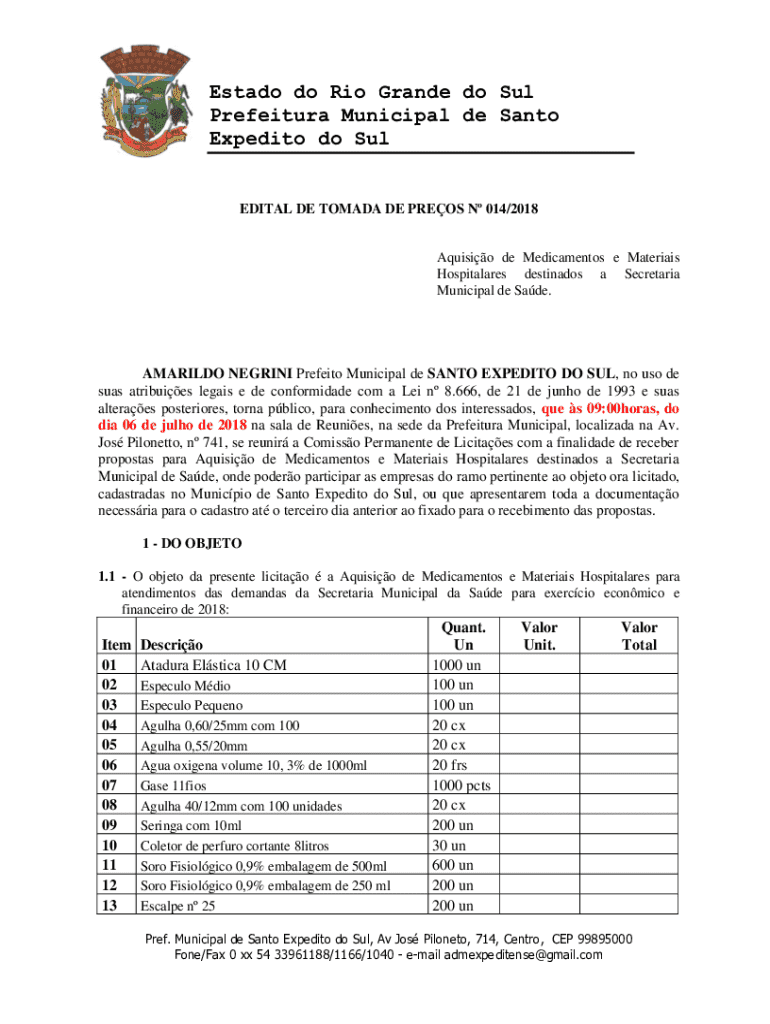 Este edital tem como objetivo a aquisição de medicamentos e materiais hospitalares destinados à Secretaria Municipal de Saúde de Santo Expedito do Sul, estabelecendo as condições para participação de empresas no processo licitatório.