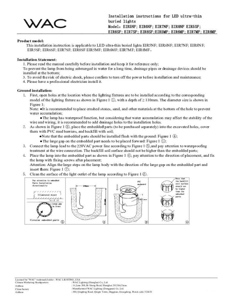 Installa ation instructions ffor LED ult trathin buried lights ModelE EIR5NF; EIR R6NF; EIR7NNF; EIR8NF EIR5SF; EIR6SF; EIR7SF; EIR8SF;EIR5MMF; EIR6MF; EIR7MF; EIIR8MF Prroduct modeel: This instaallation instruuction is appliicable to LED D ultrathin buried lights EIR5NF; E EIR R6NF; EIR7N NF; EIR8NF; EIR5SF;; EIR6SF; EIR R7SF; EIR8S SF EIR5MF; EIR6MF; EIR R7MF; EIR8MF In nstallation Sttatement: 1. Please reead the manuaal carefully before installaation and keep p it for reference only; To