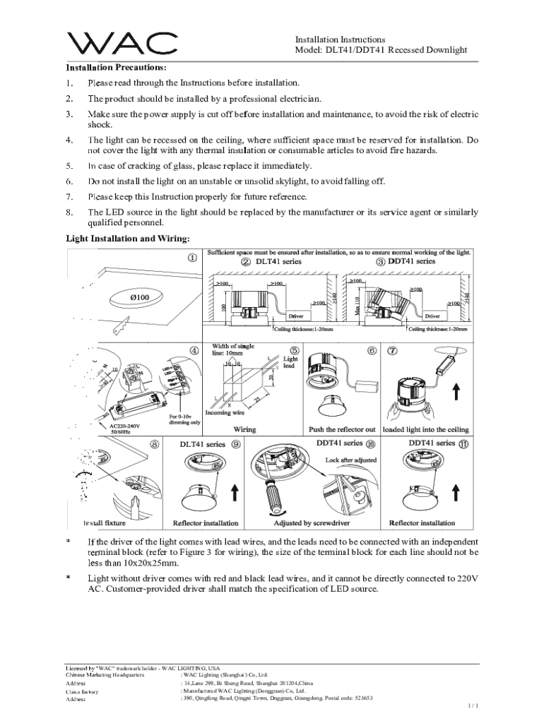 This document provides installation instructions for recessed downlight models DLT41/DDT41 R, DLT51/DDT51 R, and DLT61/DDT61 R. It includes safety precautions, installation procedures, and wiring