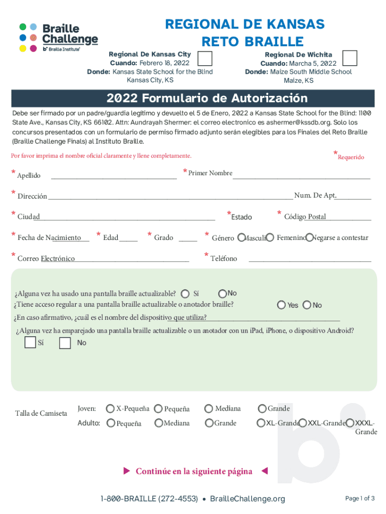 Este formulario debe ser completado y firmado por un padre o guardián legítimo para autorizar la participación de un estudiante en el Reto Braille. Debe ser devuelto antes del 5 de enero de 2022