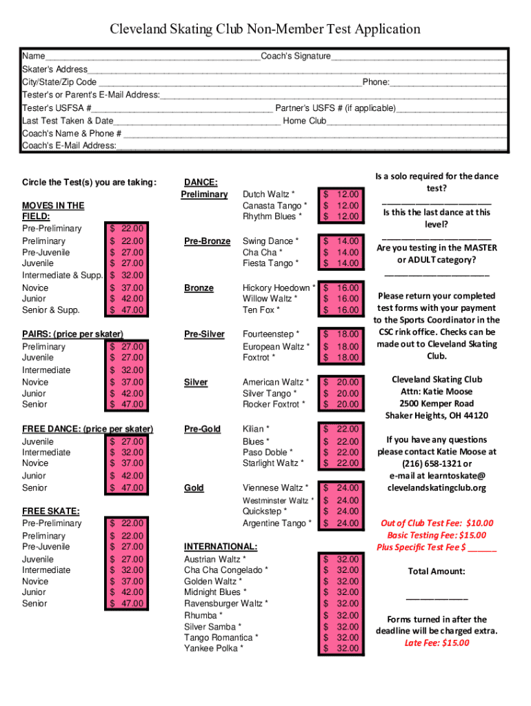 This application is for non-members of the Cleveland Skating Club who wish to register for skating tests. It includes sections for personal information, test selection, fees, and submission details.