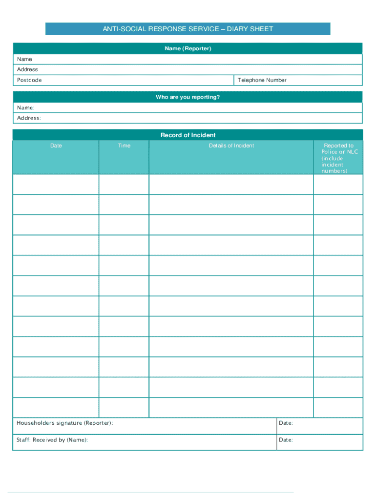 Get the free Anti-social Response Service – Diary Sheet