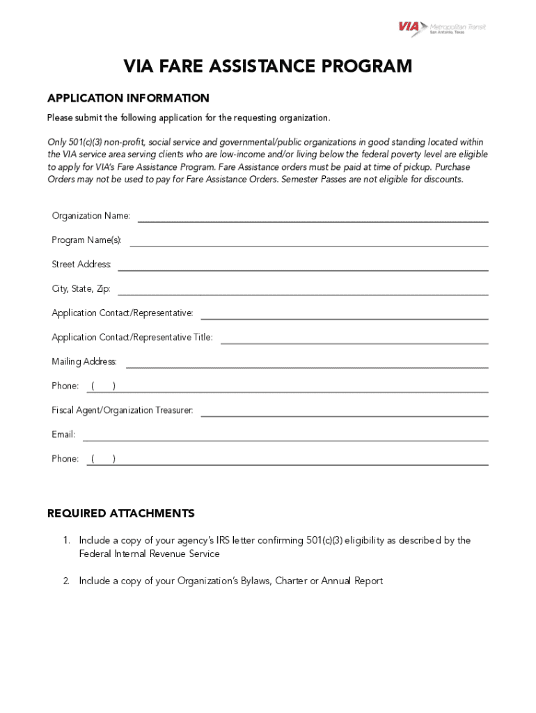 This document is an application for organizations to request assistance from VIA\'s Fare Assistance Program. It outlines eligibility criteria, required documentation, and application procedures for