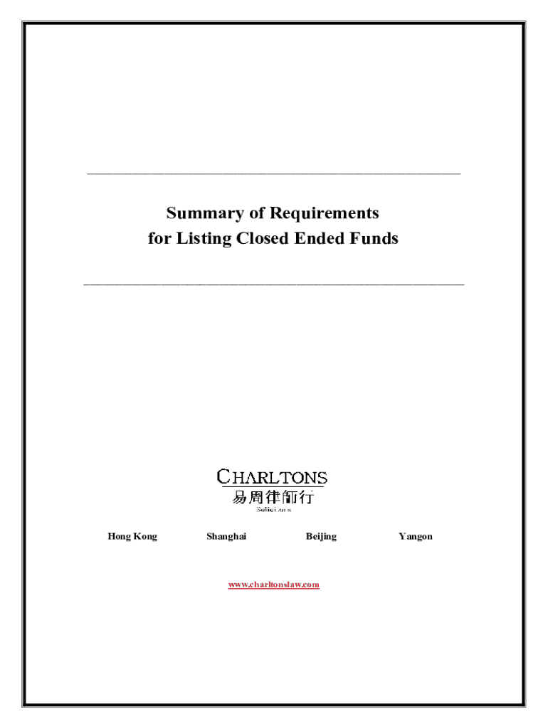 ___Summary of Requirements for Listing Closed Ended Funds ___Hong KongShanghaiBeijingwww.charltonslaw.comYangonSUMMARY OF REQUIREMENTS FOR LISTING CLOSED ENDED FUNDSHONG KONG STOCK EXCHANGE LIMITEDBERMUDA