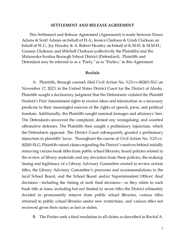 SETTLEMENT AND RELEASE AGREEMENT This Settlement and Release Agreement (Agreement) is made between Dawn Adams & Scott Adams on behalf of H.A.; Jessica Clarkson & Uriah Clarkson on behalf of W.C.; Joy Heasley & A. Robert Heasley on behalf of K.MH. & M.MH.; Gannon Clarkson; and Mitchell Clarkson (collectively the Plaintiffs) and the MatanuskaSusitna Borough School District (Defendant). Plaintiffs and Defendant may be referred to as a \"Party,\" or as \"Parties,\" in this Agreement. Recitals A....