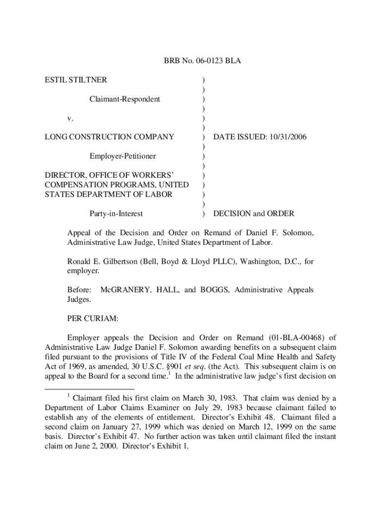 Decisión y orden relativa a un reclamo posterior presentado por Estil Stiltner en virtud de la Ley de Salud y Seguridad de Minas de Carbón de 1969. El juez de derecho administrativo determinó que