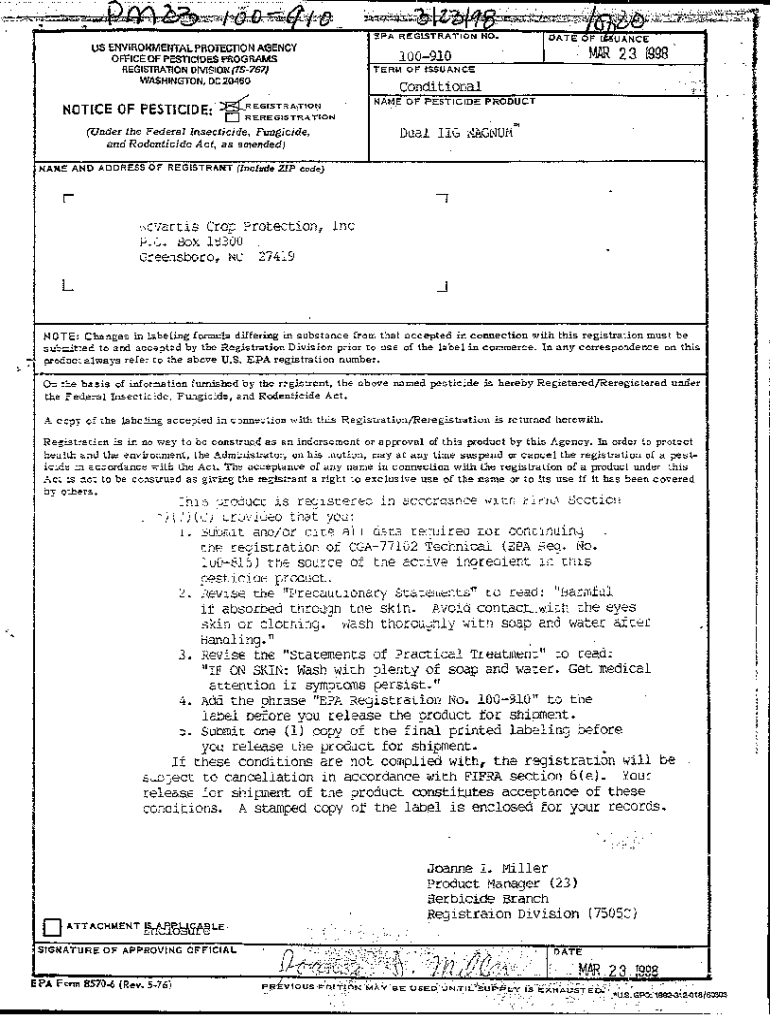 US ENVIRONMENTAL PROTECllON AGENCY OFFICE OF PESTICIDES PROGRAMS REGISlRATION DlVISION(TS767J WASHINGTON. DC 20460TERM OF ISSUANCEConditionalNOTICE OF PESTICIDE: EG\'STRATIONoNAM,E OF PESTICIDE PRODUCTREREGISTRATIONDual II G llAGNUi1(Under the Federal Insecticide Fungicide, and Rodenticide Act, as amended) 7NAME AND ADDRESS OF REGISTRANT (Include ZIP code)r llartis ero,; Protection, IncP.:.Box Hi300G:eensboro, NC27419L.J .., .NOTE: Changes in 1a.beling