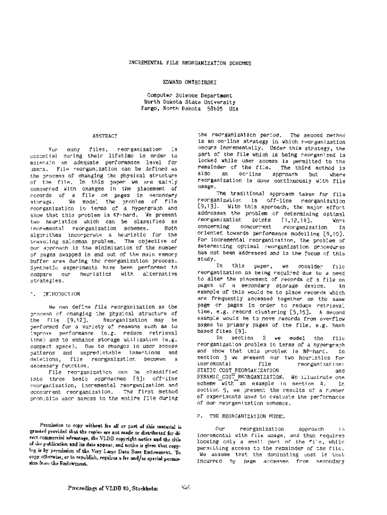 INCREMENTAL FILE REORGANIZATION SCHEMESEDWARD OMIECINSKI Computer Science Department North Dakota State University Fargo, North Dakota 58105 USAthe reorganization period. The second method is an online