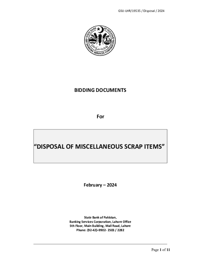 This document details the bidding process for the disposal of miscellaneous scrap items at the State Bank of Pakistan, Banking Services Corporation, Lahore Office. It includes terms and conditions for potential bidders, bidding schedule, and requirements for bid security.