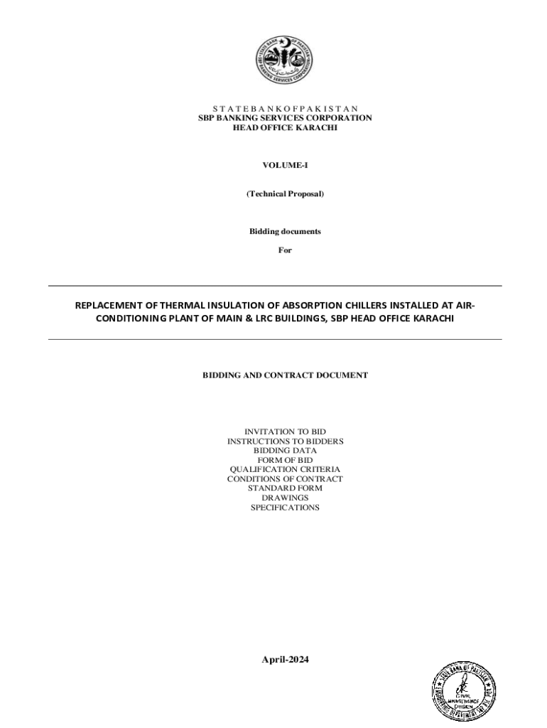 Documents related to the bidding process for replacing thermal insulation of absorption chillers at the SBP Head Office, Karachi including instructions to bidders, bidding data, conditions of contract, standard forms, and specifications.