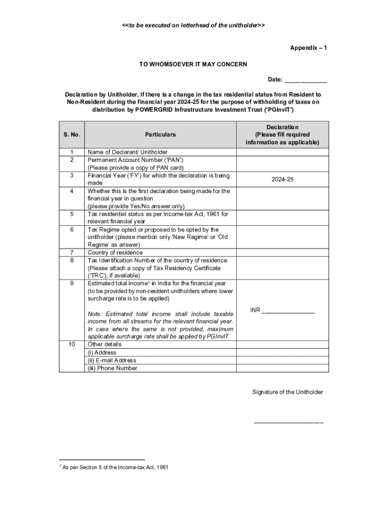 to be executed on letterhead of the unitholderAppendix 1 TO WHOMSOEVER IT MAY CONCERN Date: ___ Declaration by Unitholder, if there is a change in the tax residential status from Resident to NonResident during the financial year 202425 for the purpose of withholding of taxes on distribution by POWERGRID Infrastructure Investment Trust (PGInvIT)S. No.Particulars1 2Name of Declarant/ Unitholder Permanent Account Number (PAN) (Please provide a copy of PAN card) Financial