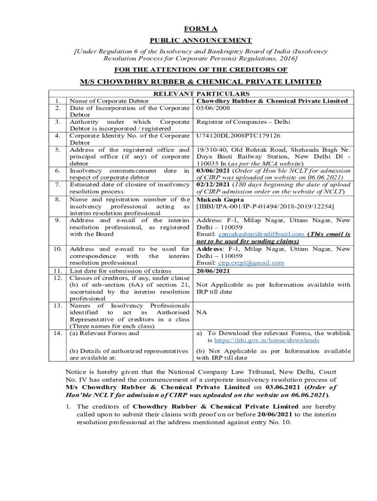 This document serves as a public announcement regarding the corporate insolvency resolution process for M/s Chowdhry Rubber & Chemical Private Limited, including details on the creditors\' claims