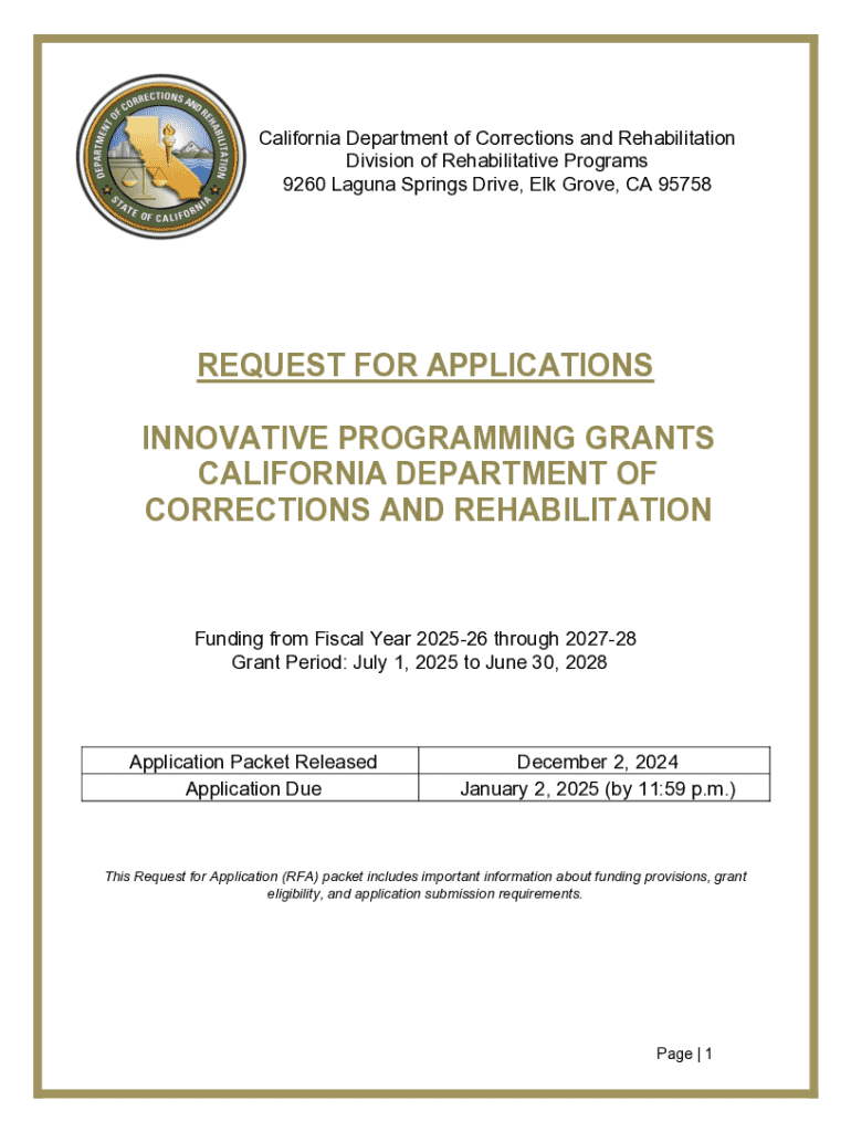 Este documento proporciona información necesaria para presentar una propuesta a la California Department of Corrections and Rehabilitation (CDCR) para fondos de subsidios disponibles en los años fiscales 2025-26 a 2027-28 para Subsidios de Programación Innovadora (IPG).