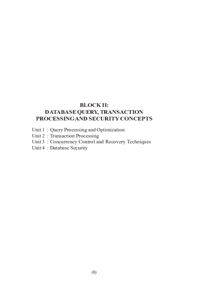 BLOCK II: DATABASE QUERY, TRANSACTION PROCESSING AND SECURITY CONCEPTS Unit 1 Unit 2 Unit 3 Unit 4: Query Processing and Optimization : Transaction Processing : Concurrency Control and Recovery Techniques : Database Security(6)UNIT 1: QUERY PROCESSING AND OPTIMIZATION Unit Structure: 1.1Introduction1.2Objectives1.3Query Processing1.3.1 Block Diagram to show the steps of conversion 1.3.2 Equivalence Rules 1.4Query Optimization 1.4.1 Query Cost Measurement 1.4.2 Generation of Equivalence...