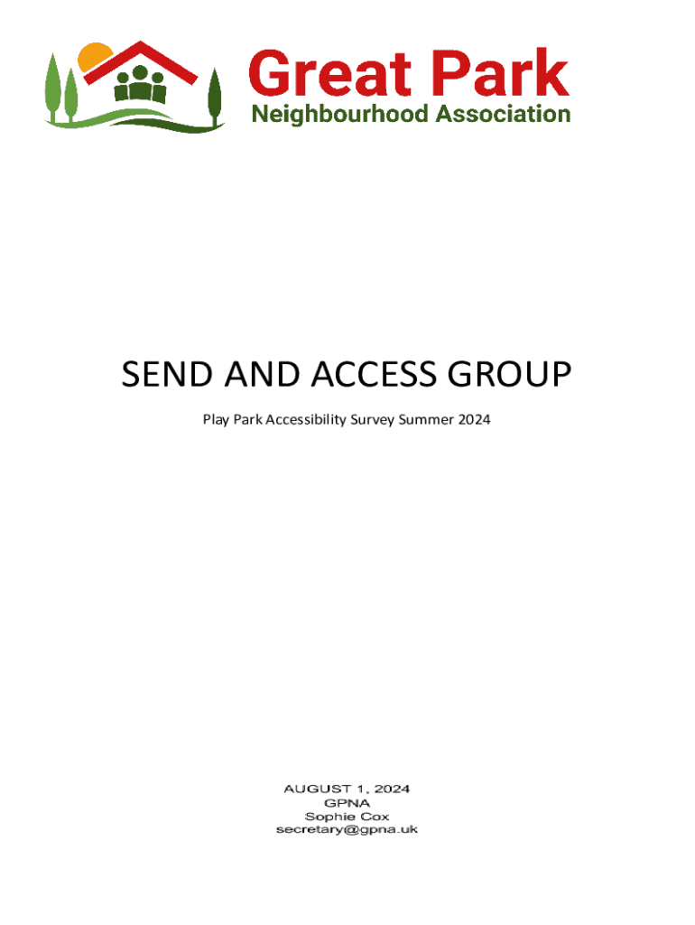 This document presents the findings from a survey conducted to evaluate the accessibility of play parks in Great Park. The survey aimed to identify issues faced by residents, particularly those with accessibility needs, regarding the suitability of the parks and the equipment available. Recommendations for improvements are provided, emphasizing the need for suitable pathways, surfaces, and inclusive play equipment to meet the expectations of the Equality Act 2010.