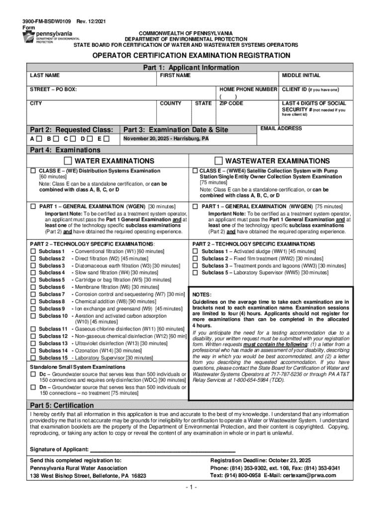 This form is used for the registration of applicants for the Operator Certification Examination for Water and Wastewater Systems Operators in Pennsylvania. It collects personal information, examination class selections, and requested examination dates and sites.