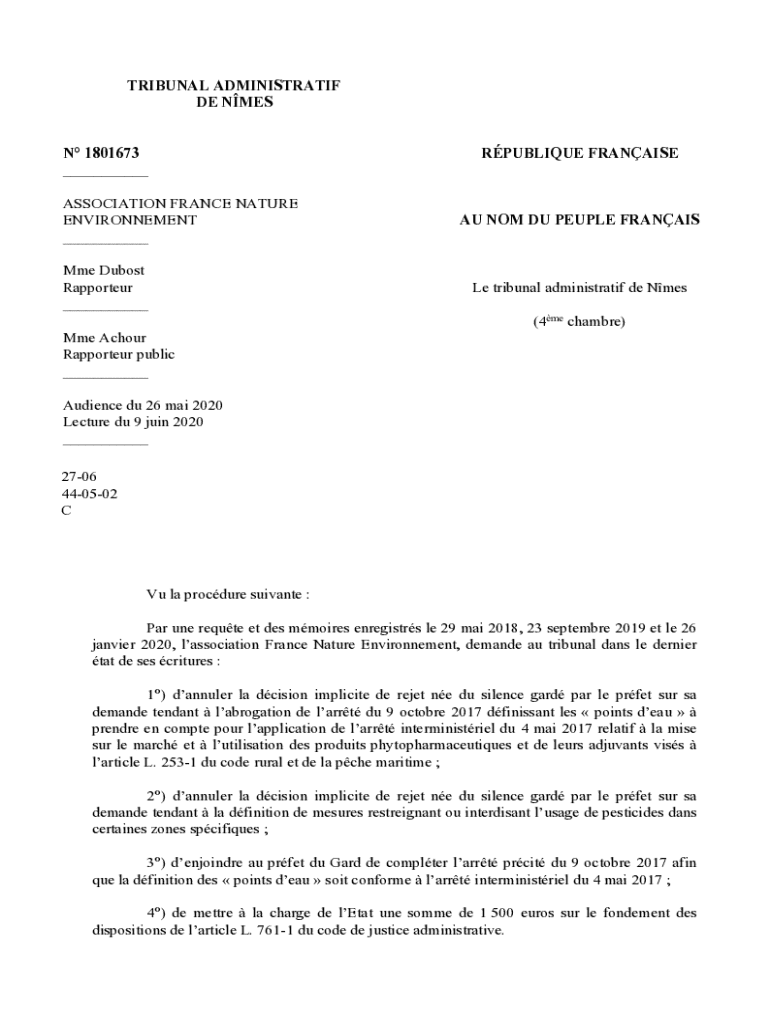 TRIBUNAL ADMINISTRATIF DE NMES N 1801673 ___ ASSOCIATION FRANCE NATURE ENVIRONNEMENT ___ Mme Dubost Rapporteur ___RPUBLIQUE FRANAISEAU NOM DU PEUPLE FRANAISLe tribunal administratif de Nmes (4me chambre)Mme