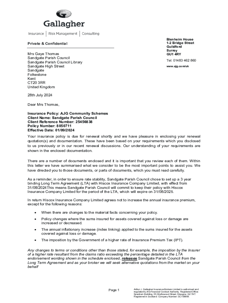 Blenheim House 12 Bridge Street Guildford Surrey GU1 4RYPrivate & Confidential Mrs Gaye Thomas Sandgate Parish Council Sandgate Parish Council Library Sandgate High Street Sandgate Folkestone Kent CT20 3RR United KingdomTel: 01483 462 860 www.ajg.com/uk28th July 2024 Dear Mrs Thomas, Insurance Policy: AJG Community Schemes Client Name: Sandgate Parish Council Client Reference Number: 25456838 Policy Number: 8050711 Effective Date: 01/09/2024 Blenheim House 12 Bridge Street Guildford Surrey...