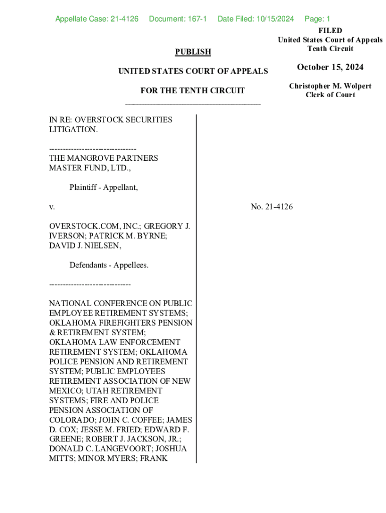 Appellate Case: 214126Document: 1671Date Filed: 10/15/2024Page: 1PUBLISHFILED United States Court of Appeals Tenth CircuitUNITED STATES COURT OF APPEALSOctober 15, 2024FOR THE TENTH CIRCUIT ___Christopher M. Wolpert Clerk of CourtIN RE: OVERSTOCK SECURITIES LITIGATION. THE MANGROVE PARTNERS MASTER FUND, LTD., Plaintiff Appellant, v.No. 214126OVERSTOCK.COM, INC.; GREGORY J. IVERSON; PATRICK M. BYRNE; DAVID J. NIELSEN, Defendants Appellees