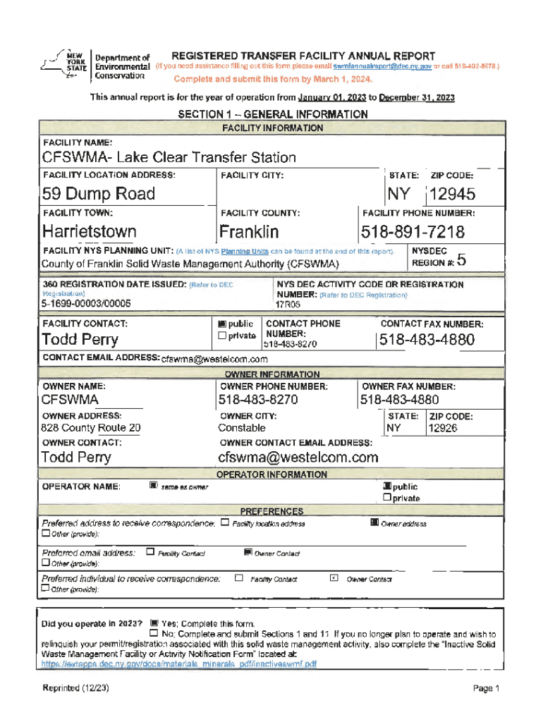 This annual report provides detailed information about the operations of the CFSWMA - Lake Clear Transfer Station for the year 2023, including solid waste received, service area, recycling activities, and compliance with reporting requirements.