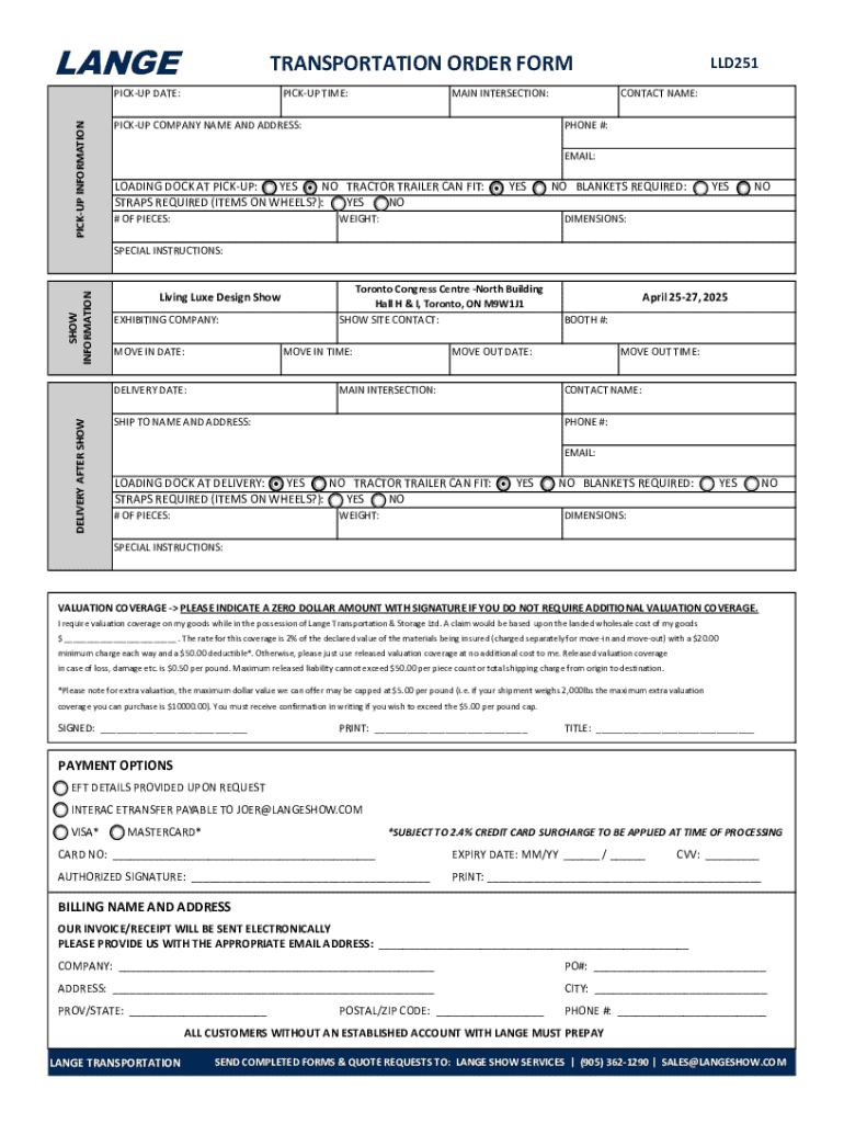 This form is used to arrange transportation services for shows, including pick-up and delivery details, valuation coverage options, and payment information.