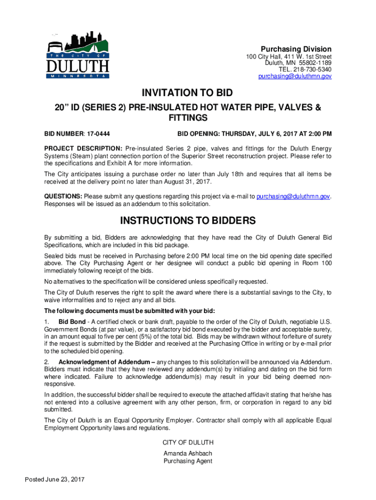 This document serves as an invitation for bidding on pre-insulated Series 2 pipe, valves, and fittings for the Duluth Energy Systems (Steam) plant connection as part of the Superior Street reconstruction project. It outlines the bid requirements, specifications, submission procedures, and conditions related to the bidding process.