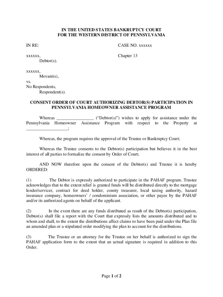 IN THE UNITED STATES BANKRUPTCY COURT FOR THE WESTERN DISTRICT OF PENNSYLVANIA IN RE:CASE NO. xxxxxxxxxxxx, Debtor(s).Chapter 13xxxxxx, Movant(s), vs. No Respondents, Respondent(s). CONSENT ORDER OF COURT AUTHORIZING DEBTOR(S) PARTICIPATION IN PENNSYLVANIA HOMEOWNER ASSISTANCE PROGRAM Whereas ___ (Debtor(s)) wishes to apply for assistance under the Pennsylvania Homeowner Assistance Program with respect to the Property at ___; Whereas, the program requires the approval of the Trustee