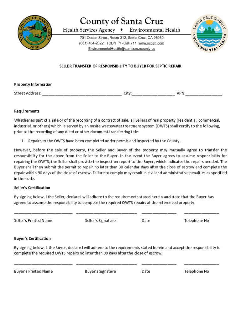 County of Santa Cruz Health Services Agency Environmental Health701 Ocean Street, Room 312, Santa Cruz, CA 95060 (831) 4542022 TDD/TTY Call 711 www.scceh.com EnvironmentalHealth@santacruzcounty.usSELLER TRANSFER OF RESPONSIBILITY TO BUYER FOR SEPTIC REPAIRProperty Information Street Address: ___ City:___ APN:___Requirements Whether as part of a sale or of the recording of a contract of sale, all Sellers of real property (residential, commercial, industrial, or others) which is served