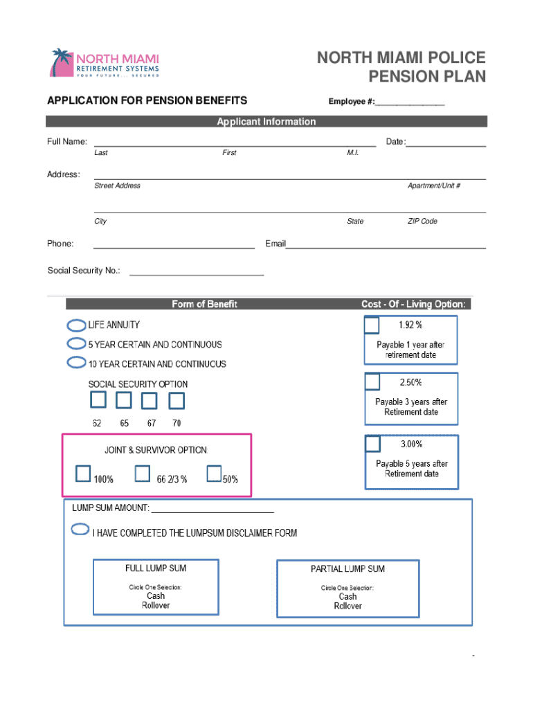 This document is an application form for pension benefits for employees of the North Miami Police Department, detailing various options for receiving benefits, including survivor options, lump sum rollovers, cash distributions, and annuities. It includes necessary applicant information, tax withholding choices, direct deposit details, and a disclaimer signature section.