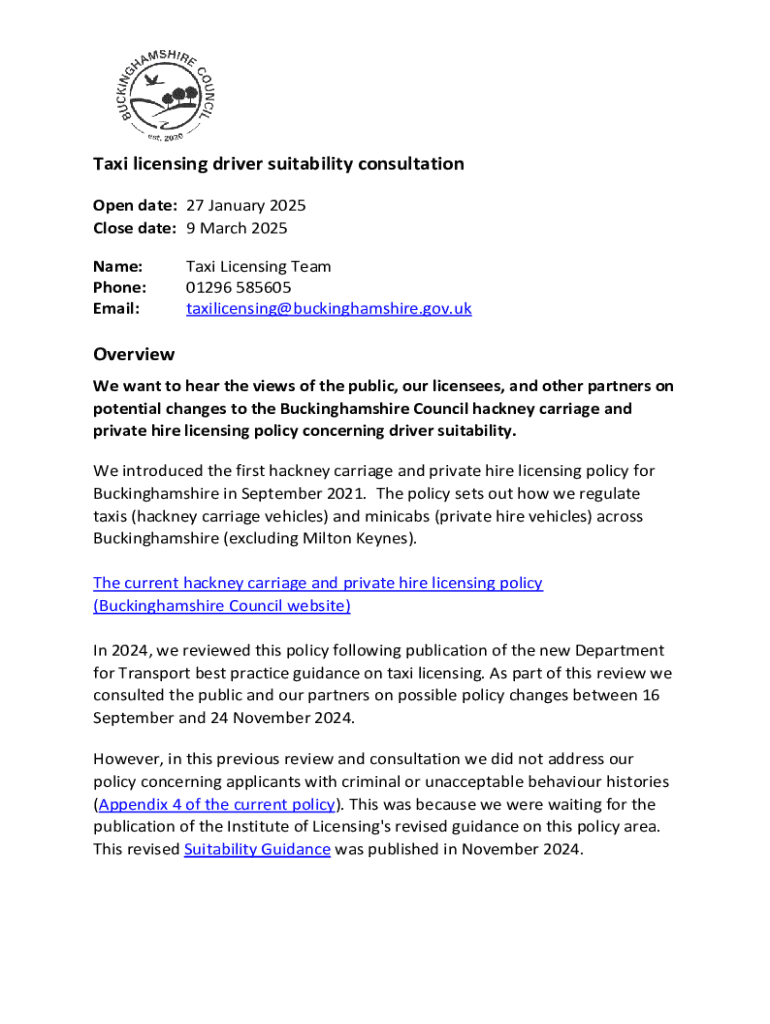 We want to hear public views on potential changes to the Buckinghamshire Council hackney carriage and private hire licensing policy regarding driver suitability in light of new Department for Transport guidance and revised Institute of Licensing\'s Suitability Guidance.