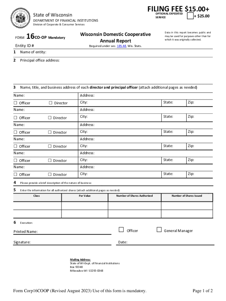 This form is mandatory for filing the required annual report for a Domestic Cooperative in Wisconsin, as stipulated under sec. 185.48, Wis. Stats. It requires details such as entity name, principal office address, directors and officers, nature of business, and authorized shares. Failure to file may result in involuntary dissolution.