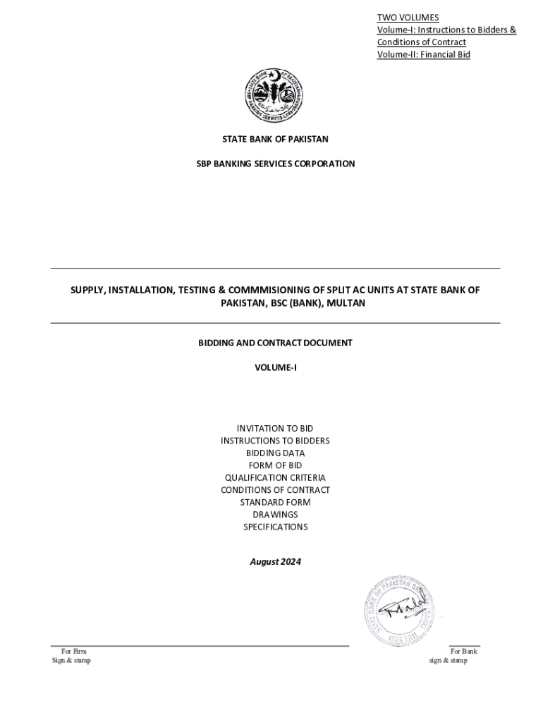 This document serves as an invitation to bid, outlining the instructions to bidders, qualifications required, conditions of contract, and specifications for the supply, installation, testing, and commissioning of split air conditioning units at the State Bank of Pakistan, Banking Services Corporation in Multan.